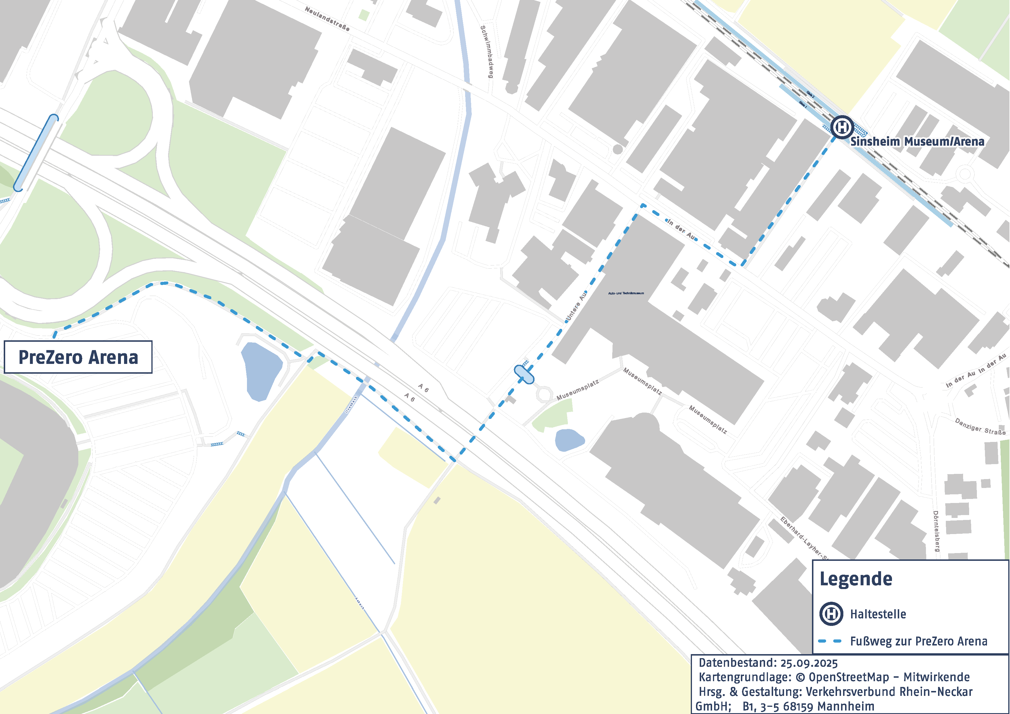 Vom Bahnhof "Sinsheim Museum/Arena" ist die PreZero-Arena in ca. 10 - 15 Minuten erreichbar.